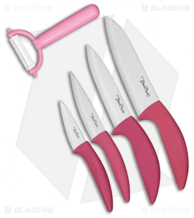 The Benchmark 5-Piece Ceramic Kitchen set is a great addition to any kitchen! White zirconium oxide blades maintain an extremely sharp edge while pink rubberized handles provide a comfortable and secure grip.