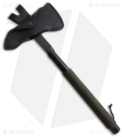The Condor Knife & Tool TRT (Tactical Rescue Tomahawk) Axe has a 7″ head. It is made from 1075 high carbon steel and finished with a black epoxy powder coat. The steel handle is a strong hollow tube with an OD green cord wrap for grip. This axe comes with a protective leather sheath.