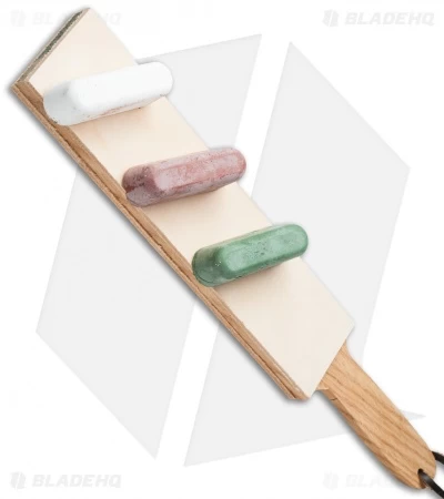This paddle strop from Garos goods features maple wood construction and a double sided, tanned cow hide leather strop. The strop is 2.0″ by 8.125″, with an overall length of 11.875″. Item includes 3 stropping compounds for super fine, ultra fine, and micro fine knife edges. It also includes a brown leather lanyard strap. An essential item for any sharpening kit.