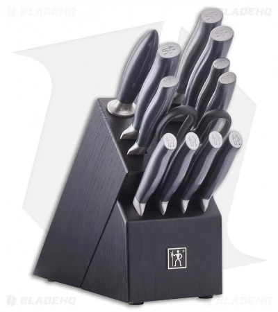The Henckels International Graphite 13 Piece Set will fully equip any kitchen. These dishwasher-safe knives are outfitted with graphite-gray handles and fully forged bolsters. The set includes an 8″ chef’s knife, a 7″ hollow-ground santoku, an 8″ bread knife, a 5″ serrated utility knife, a 4″ paring knife, a 3″ paring knife, four steak knives, a sharpening steel, kitchen shears, and a storage block.