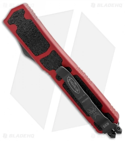 The Microtech Makora represents the evolution of the Ultratech. The Makora has the same sleek styling and features a double edged blade with a stonewash finish and plain edges. The body is red anodized and has grip tape inserts for maximum gripability. The Makora is double action- it fires in and out automatically via the sliding firing button on the right side of the knife body. Comes with a pocket clip.