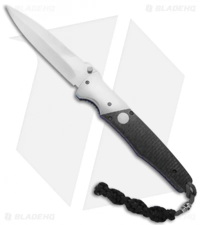 This custom handmade Vallotton is a dual-action automatic with thumb studs for manual operation and a push button for fast automatic action. The Merc Series 2 is a beautiful piece with a carbon fiber handle, titanium liners, stainless steel bolsters, and G10 back spacer. The blade is satin finished with hollow grinds.