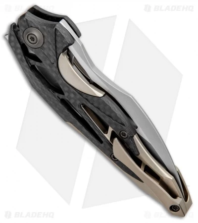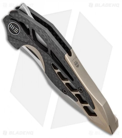 This model of the WE Knife Co. Arrakis sports a champagne anodized titanium and carbon fiber handle with a stonewashed M390 blade.