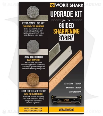 The Work Sharp Upgrade Kit is designed to extend the sharpening range of their Guided Sharpening System. It includes an extra fine diamond plate, extra coarse diamond plate, leather stropping kit with angle guides, and a chromium oxide honing compound. The extra fine plate has an 800 grit for refining your blade edge, ideal for finishing or resharpening a blade. The extra coarse plate has a 220 grit that is perfect for removing material when re-profiling or repairing a blade edge. The leather stropping kit can be used as the final step for refining the blade to its sharpest possible edge. When combined with the honing compound it provides a professional edge that can stand up to any task.